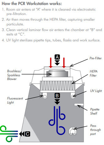 48" wide combination PCR workstation with UVTect microprocessor controller. Workstation provides Class 100 vertical laminar air flow and timed uv light for sterilization. Price includes HEPA filters, initial prefilters, fluorescent lights, UV shelf with pipette holder, safety switch and slip hatch. 110V AC UL, CSA & CE approved