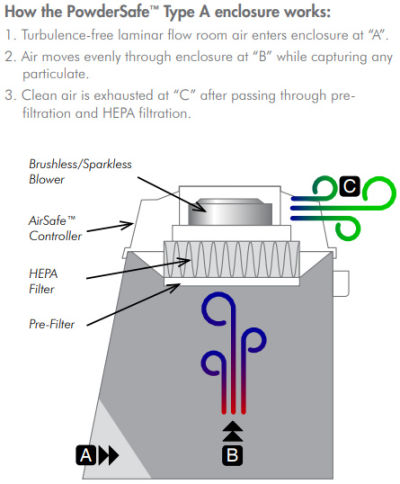 32" wide PowderSafe Type A ductless balance enclosure fitted with AirSafe automatic safety controller. Price includes HEPA filter, initial pre-filter, and two slip hatch ports. 110V AC UL, CSA & CE approved Does not come with internal fluorescent light. Offer ACAFLO